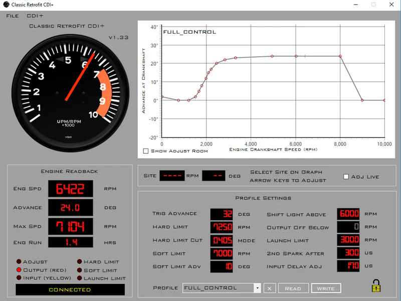 The Classic Retrofit 8-pin CDI+ unit requires no modifications to the original wiring loom harness or metalwork and is 'plug and play'. The soft and hard rev limiters can be programmed via a laptop. All CDI+ units have a 48 MHz microprocessor onboard to control ignition timing.