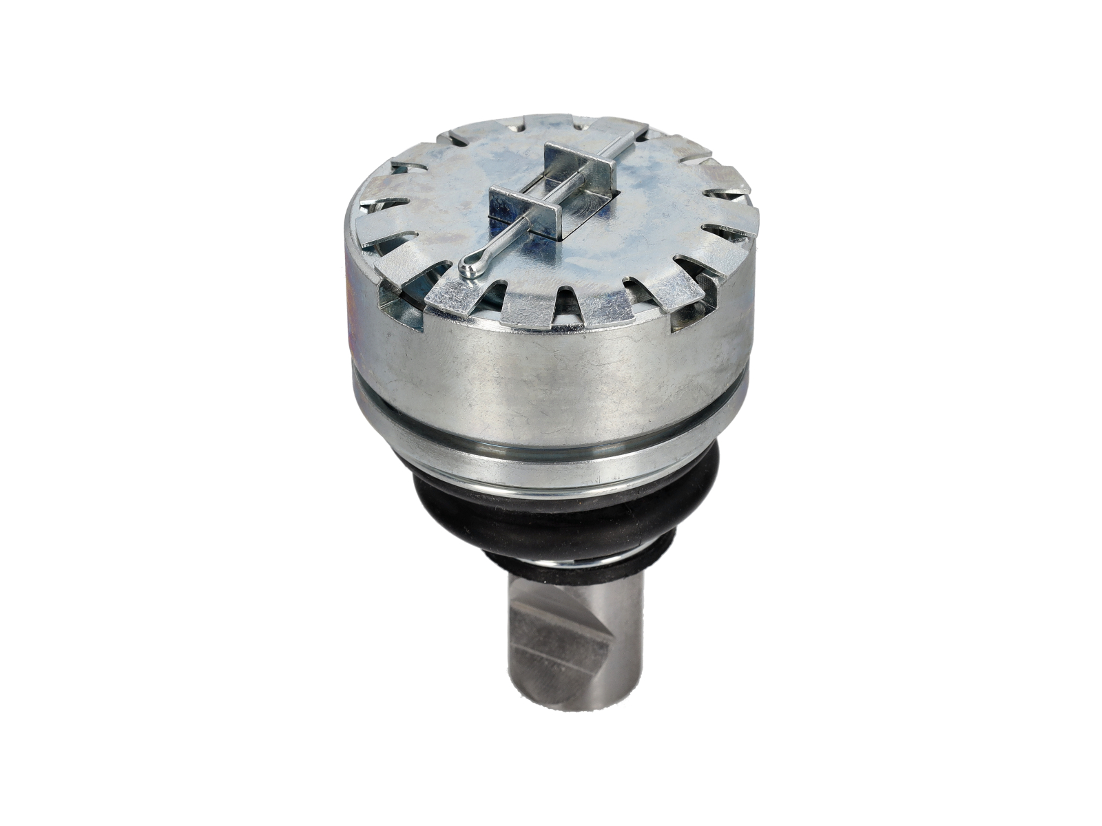 The cotter pin nut fastens the lower ball joint to the front suspension arm and secures it with a locking cotter pin through the castle slots. This prevents the nut from rotating loose, maintaining safe steering and suspension geometry during operation.