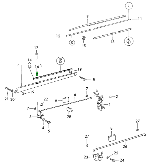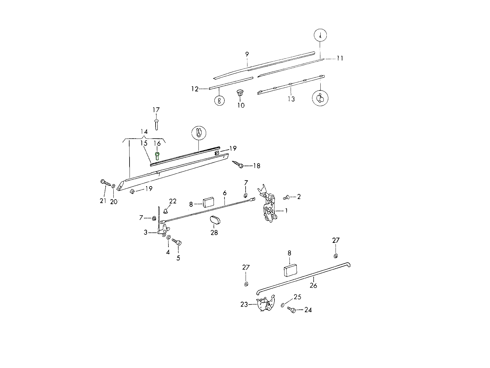 - 1965-'73 cars require retrofit of '74+ interior door handle mechanisms with associated Bowden cables, tension springs, and cable mounting clips. Part numbers and quantities for all necessary parts are below.