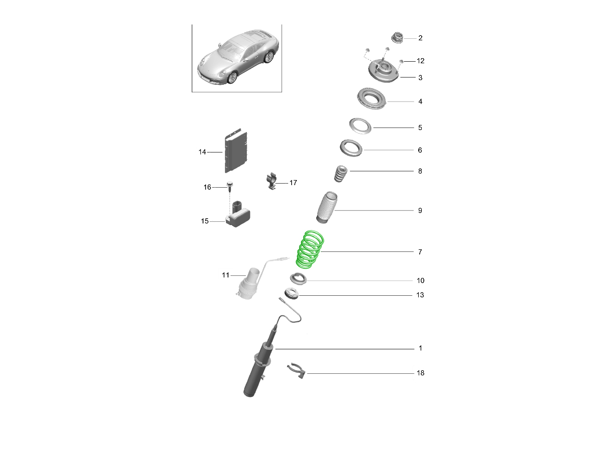 Over time, constant load, aggressive driving, and road impacts can cause springs to weaken or sag, affecting suspension geometry and performance. Replacing worn springs restores factory ride height, handling balance, and the sharp driving characteristics Porsche intended.