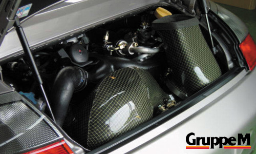 On the GruppeM intake for the Porsche 993 GT2 1996-98 , the factory ductwork is replaced with heat-shielding carbon fiber with enhanced inlets to capture the maximum amount of air. Lower intake air temperatures carry higher concentrations of oxygen, allowing for more energetic explosions and producing more horsepower and torque. Of course, reliability is never sacrificed -- high-efficiency, high-flow K&N air filter materials prevent contaminants from interfering with proper engine function.