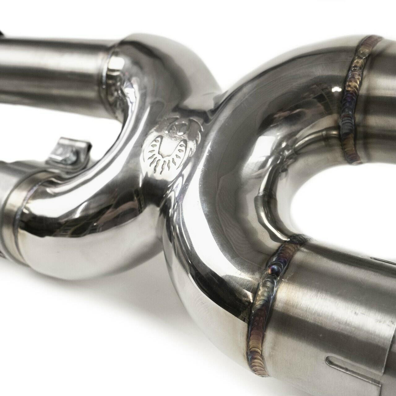 • CAD designed X-Pipe made using investment casting for maximum possible flow and spectacular sports car sound50 state emissions legal - OEM Catalytic converters are retained
