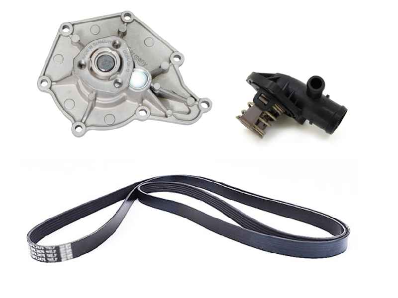 This complete water pump kit includes a new water pump, thermostat, drive (serpentine) belt and the required gaskets for both the pump and thermostat housing.