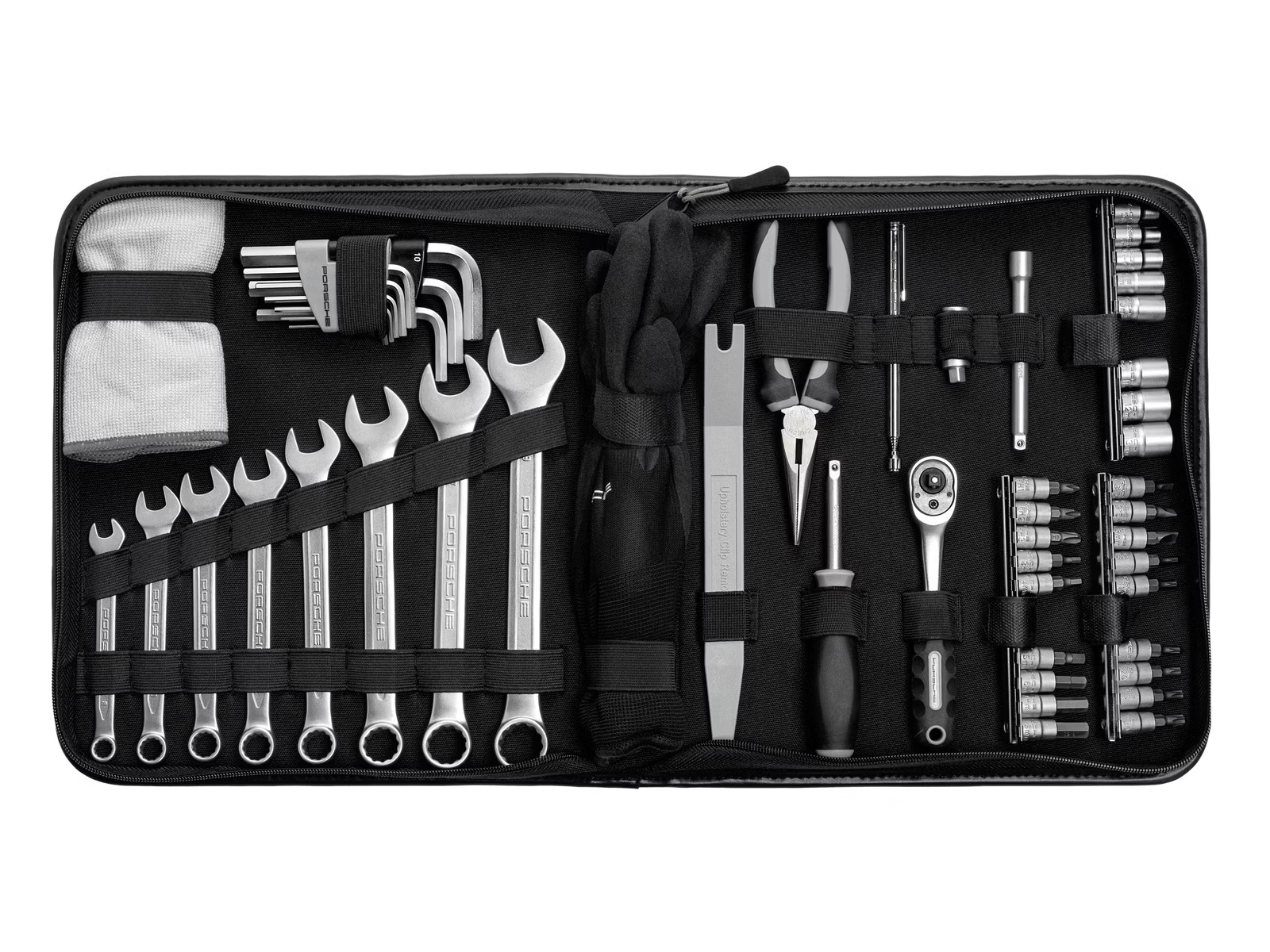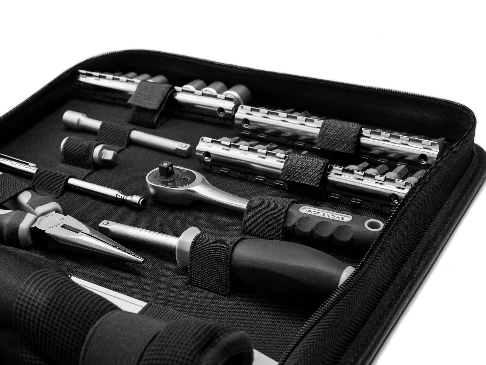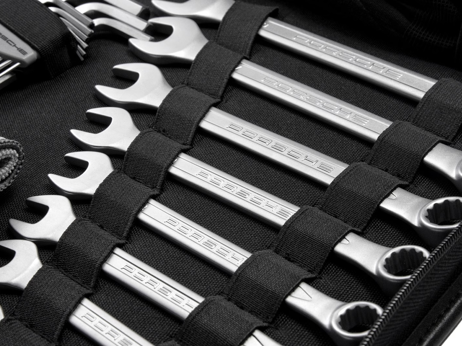 • High-quality tool set in exclusive leather case with embossed Porsche crest and Porsche logo on the tools.