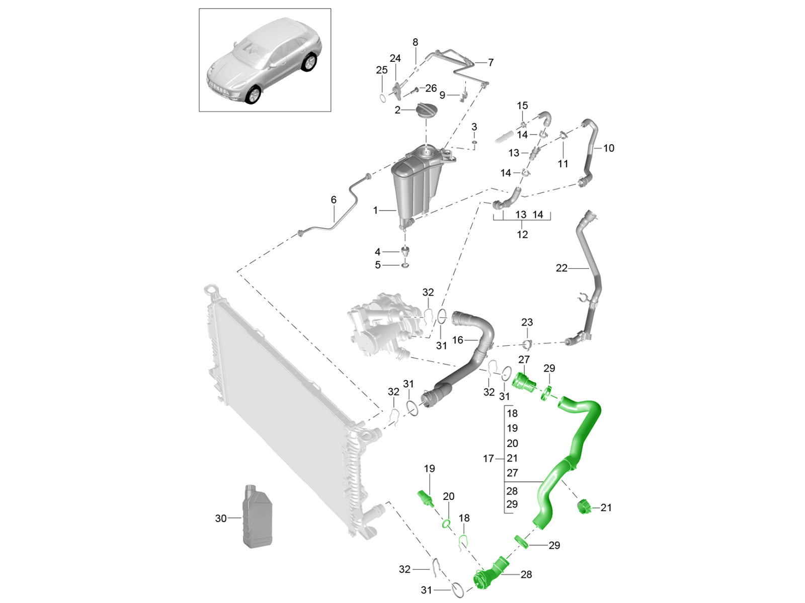 The Macan’s 2.0 L turbocharged engine relies on a closed-loop liquid cooling system to maintain stable operating temperatures. While the top coolant hose (feed) delivers hot coolant from the engine to the radiator for heat rejection, the bottom hose (return) completes the cycle by returning cooled fluid back to the engine. Both pathways must be free of restrictions, leaks, and surface deterioration to ensure consistent thermal control.