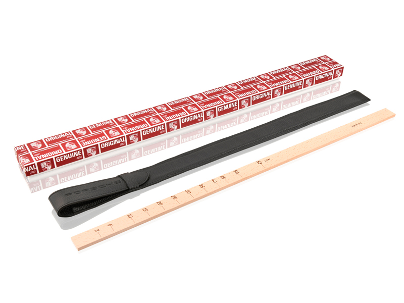 This reproduction strap for all fuel tanks has the same steel thickness, rivets and other details as original. Length is 740 mm to accommodate the 80 Liter GT tank. For normal 50 Liter tank, cut the excess strap material off. Bare steel, you paint to suit. Two straps required per car.
