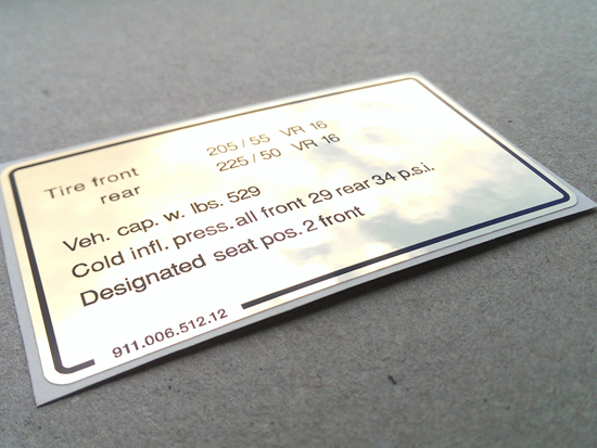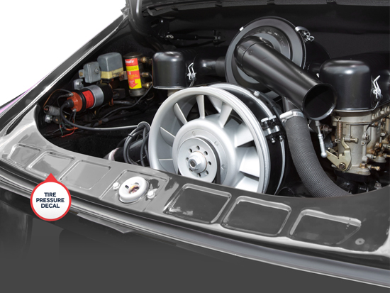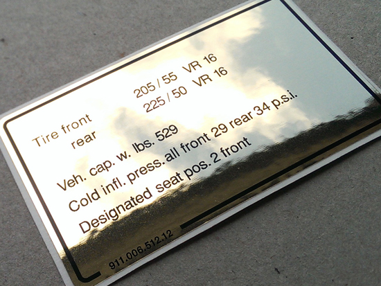 • 正宗保时捷轮胎贴花和压力信息标签。
