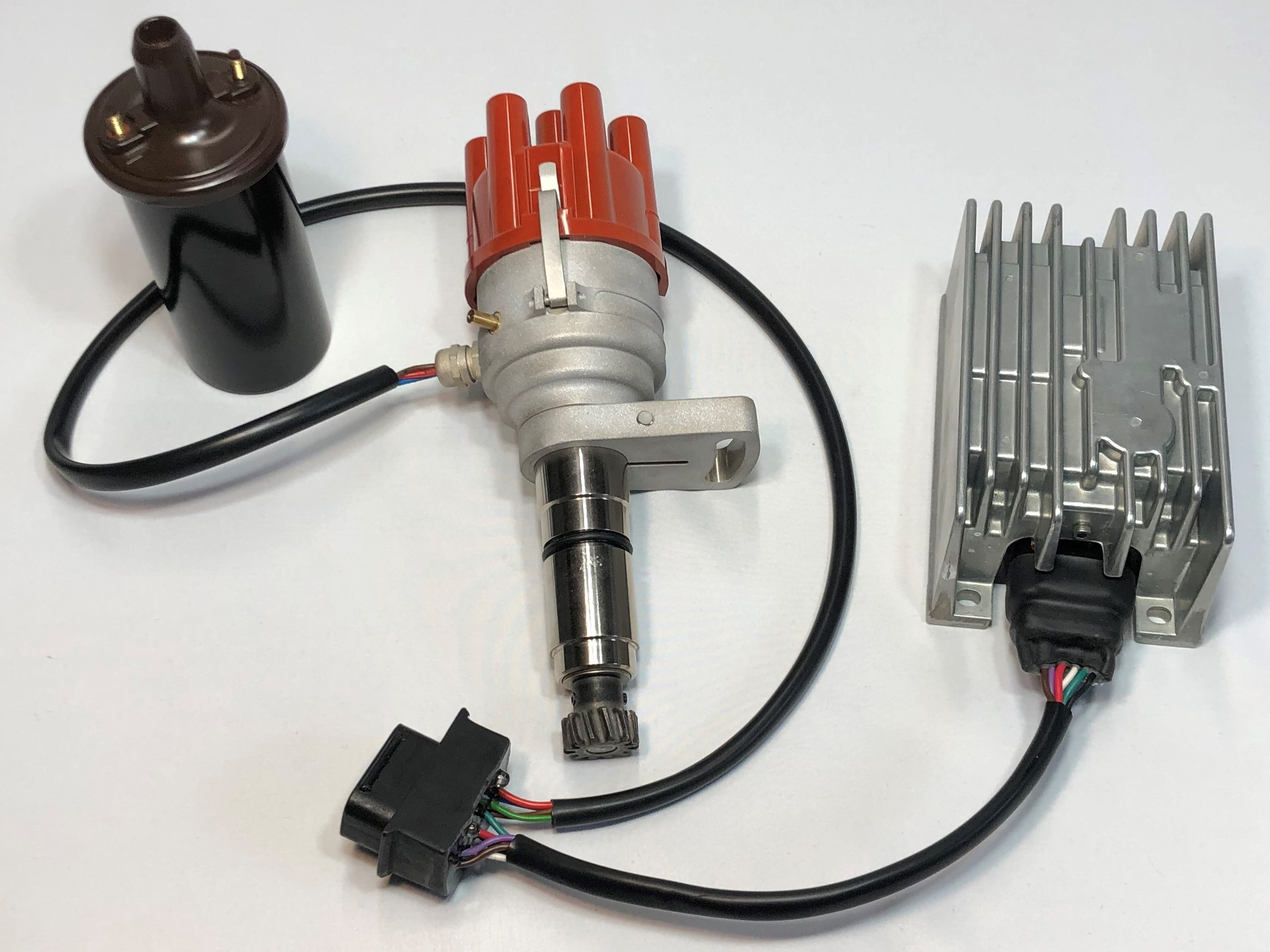 更换磨损的分电器从未如此简单,Perma-Tune 为 911SC 3.0L 发动机以及其他使用六针点火模块的发动机(例如保时捷 Turbo 930)量身定制的分电器即可轻松完成。无需剪线或拼接:分电器内置电线束,并配备与原厂兼容的连接器,即插即用。只需从点火模块上拔下汽车线束连接器,然后将其插入分电器线束上对应的连接器。接着,将分电器线束连接器插入 Perma-Tune 模块即可。此安装过程绝对不会出错,连接器只会以正确的方式插入。线束连接器内置诊断指示灯,可显示点火系统何时通电以及点火模块何时产生火花。蓝色 LED 指示灯为电源指示灯,红色 LED 指示灯为频闪灯,每次点火系统产生火花时都会闪烁,就像点火正时灯一样。