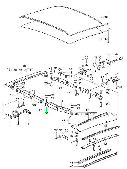 - 将 Targa 车顶框架/软顶篷的部件固定在前部。可能用于固定前车顶梁/顶梁、锁扣或软顶篷与前挡风玻璃框架或车顶框架连接处的配件。