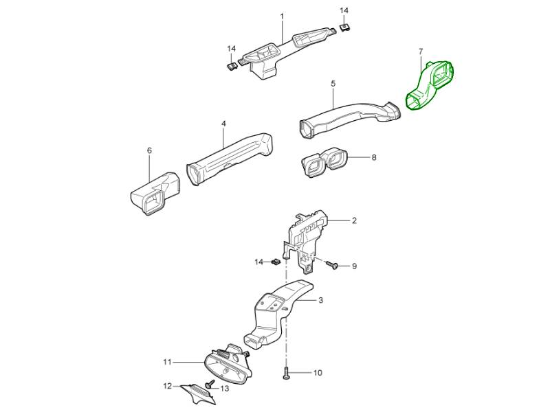 该导风管位于车内风道布局的右侧,确保空气从暖风/空调系统正确输送到仪表板通风口和周围的车厢出风口。正确的空气流动路径对于高效的加热、制冷和除雾性能至关重要。