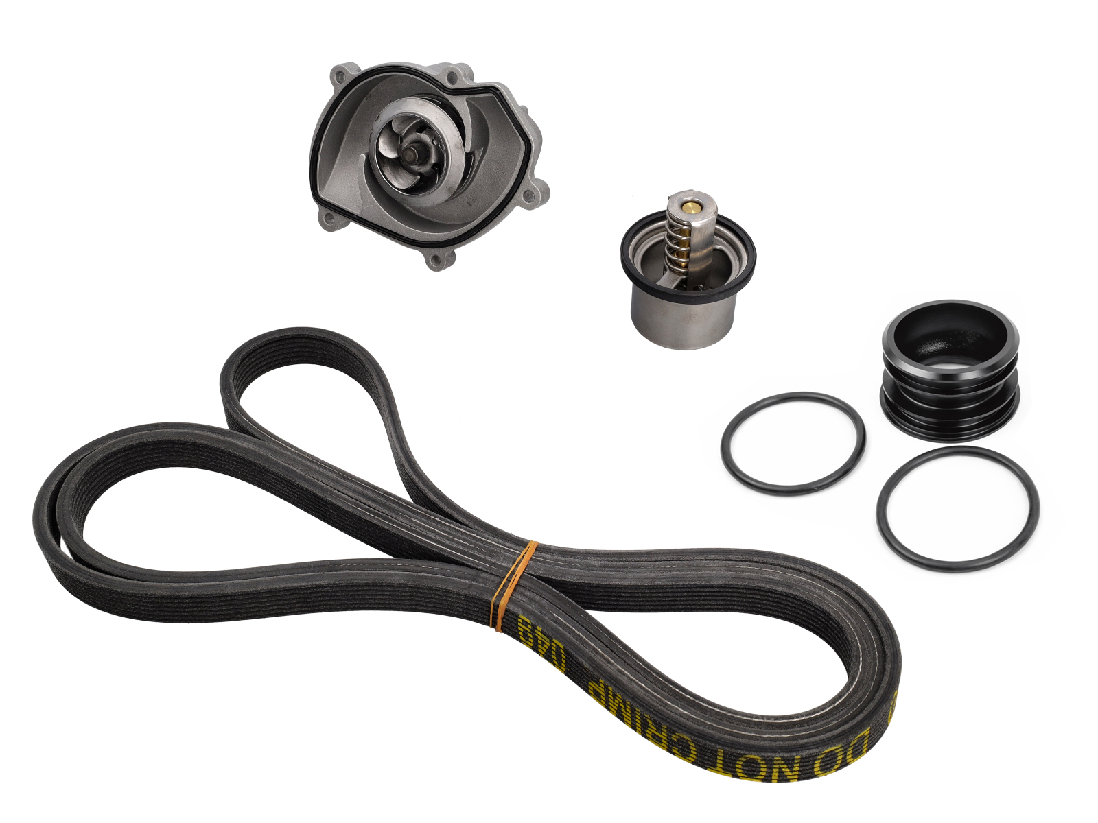 This complete water pump kit includes a new water pump, thermostat, drive (serpentine) belt and the required gaskets for both the pump and thermostat housing.